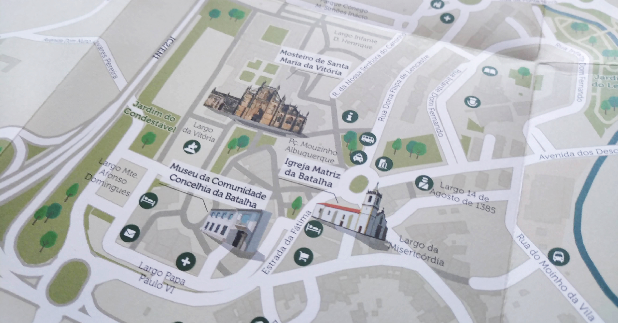 O Mapa do Centro Histórico da Batalha foca-se no Mosteiro da Batalha, enquadrado nos restantes Monumentos de Património UNESCO do Centro de Portugal: